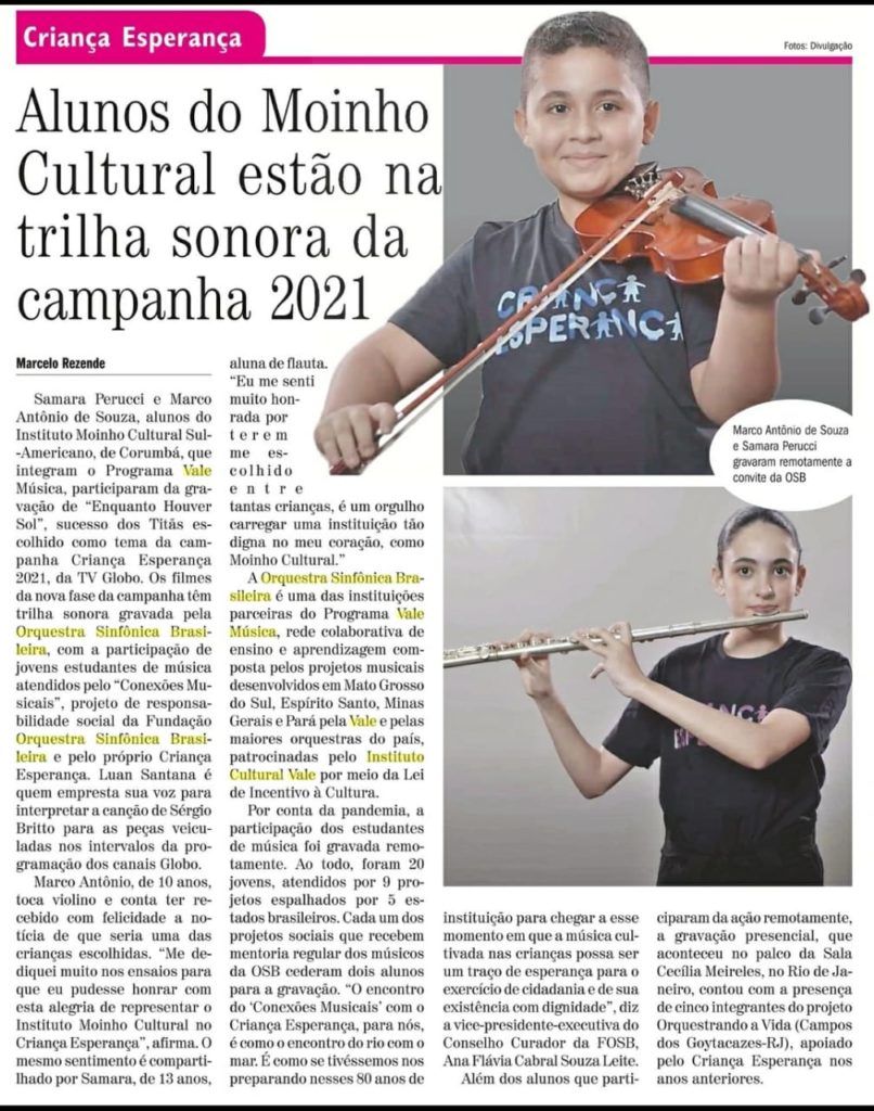 Samara Perucci e Marco Antônio de Souza, alunos do Instituto Moinho Cultural Sul-Americano, de Corumbá, que integram o Programa Vale Música, participaram da gravação de “Enquanto Houver Sol”, sucesso dos Titãs escolhido como tema da campanha Criança Esperança 2021, da TV Globo. Os filmes da nova fase da campanha têm trilha sonora gravada pela Orquestra […]